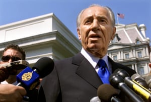 Peres, then foreign minister, speaks to the media after meeting George Bush Jr to arrange a ceasefire to end seven months of Israeli-Palestinian bloodshed in 2001. Photograph: Kevin Lamarque/Reuters